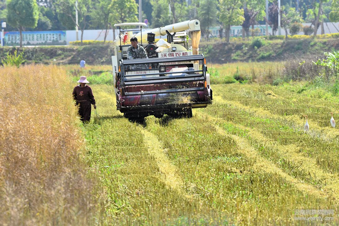 當(dāng)然,也不是所有的人都那么小心,有的人也開始使用現(xiàn)代化“武器”來收割菜籽。在田園的另一邊,一臺(tái)聯(lián)合收割機(jī)正在轟鳴著,一丘大約一畝左右的菜籽田,幾分鐘后就只有一些碎好了的殼和稈留在田間。幾只換上了“盛裝”的牛背鷺應(yīng)聲而來,在田間享受屬于自己的收獲。