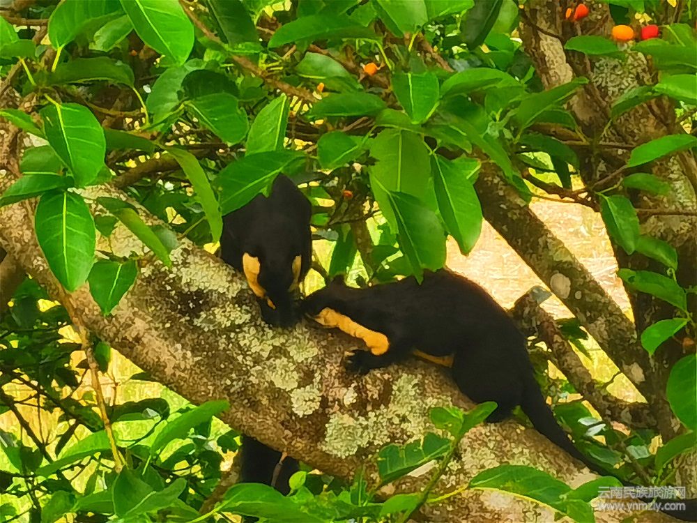 云南民族旅游網(wǎng)訊 (郁云江/文 蔡雙發(fā)/圖)5月25日,從龍陵縣木城鄉(xiāng)政府獲悉,當(dāng)?shù)剜l(xiāng)干部蔡雙發(fā)首次拍到了兩只野生巨松鼠“坐享美食”的生動(dòng)畫(huà)面。據(jù)他介紹,2020年4月以來(lái),這兩只巨松鼠經(jīng)常躥到木城鄉(xiāng)政府周邊的大青樹(shù)、紅木樹(shù)(木荷)等高大的樹(shù)上玩耍、覓食,吸引了許多當(dāng)?shù)厝顺?lái)駐足觀看,一時(shí)間它倆成為了人們議論的“焦點(diǎn)”和“主角”。