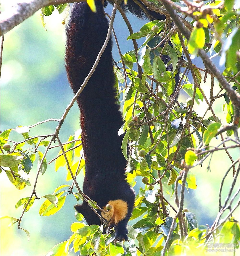 巨松鼠(Ratufa bicolor)又名樹(shù)狗、黑貍、藤貍、黑果貍等,是一種大型嚙齒類動(dòng)物。據(jù)百度資料介紹,其成體體重可達(dá)3000克,體長(zhǎng)超過(guò)40厘米,尾長(zhǎng)達(dá)60厘米,它的身高也毫無(wú)爭(zhēng)議地成為“松鼠界的巨無(wú)霸”。
