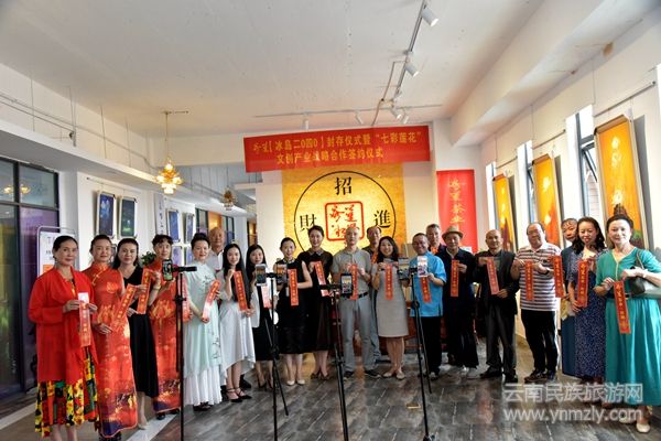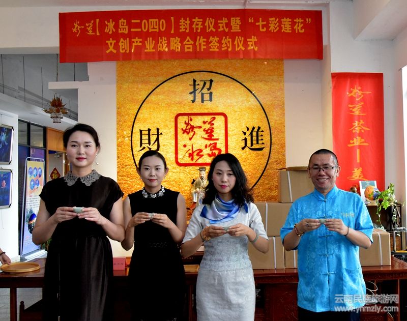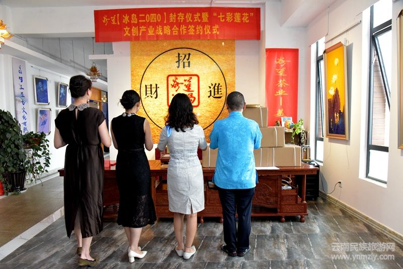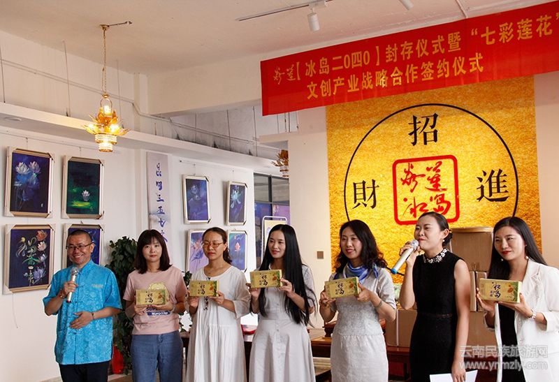 云南民族旅游網(wǎng)訊(文圖尹紹平 李關(guān)富)以丁昌勝先生七彩蓮花畫作為元素,結(jié)合冰島古樹普洱茶相互疊加的焱蓮【冰島二0四0茶磚】收藏封存儀式于一個吉祥的日子一2020年8月8日在紫云青鳥丁昌勝美術(shù)館圓滿舉辦。丁昌勝美術(shù)館與四川成都的桐鳳文創(chuàng)“七彩蓮花”文創(chuàng)產(chǎn)業(yè)戰(zhàn)略合作簽約儀式也同時成功舉行。