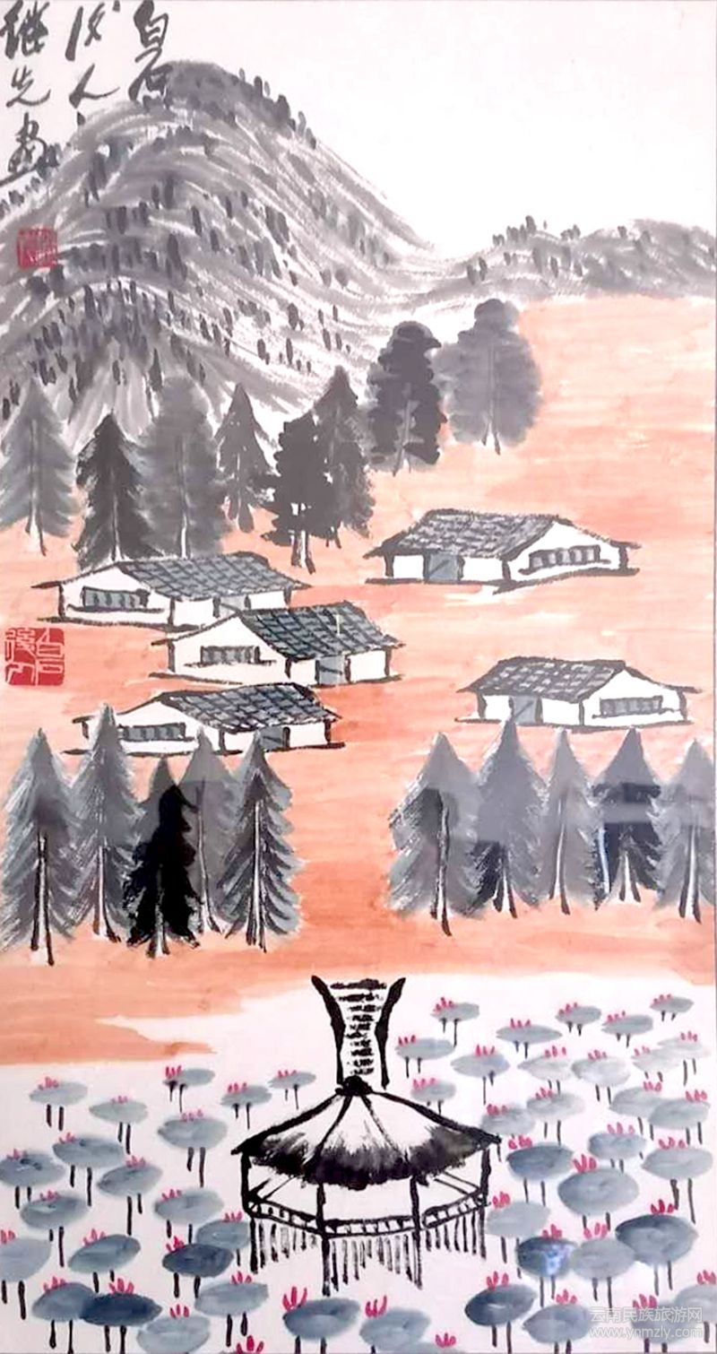 其作品《山里人家》,畫面用墨淡雅,山與農(nóng)舍布置疏密得當(dāng),墨色濃淡干濕并用,極富變化。還有趣的是,觀景亭前,五間農(nóng)舍就像一條珠鏈,錯(cuò)落有致地分布在樹(shù)木與荷花池塘之間。一眼望去,林地蔥蘢,山石疊翠,鳥(niǎo)語(yǔ)花香,讓人有種置身桃源仙境的感覺(jué)。