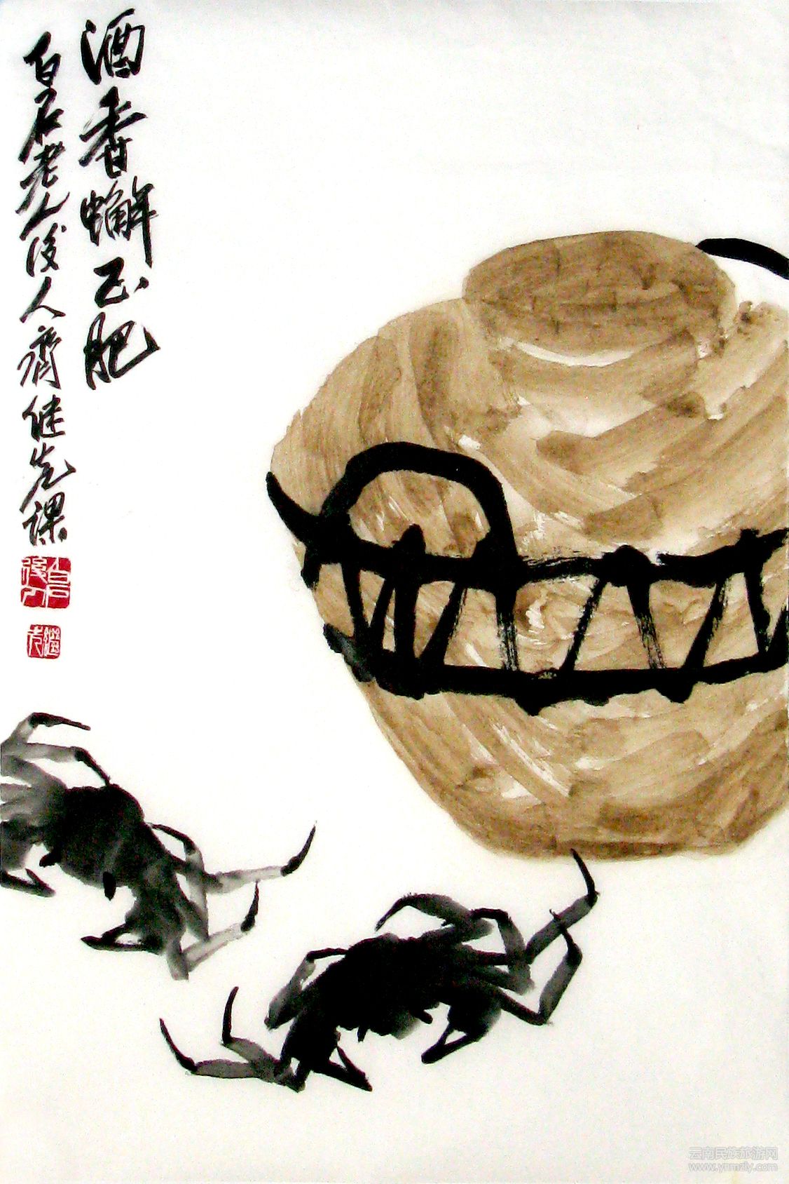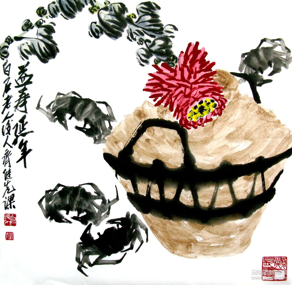 《和諧》圖,作品嚴(yán)謹(jǐn)樸實(shí),講究法度,畫風(fēng)隨意而多變。畫中四只螃蟹一上三下、背部圓鼓、腿部有扁有棱有角、有方有圓穿梭在水中,天然成趣,各顯其妙。畫面讓人產(chǎn)生遐思的是:蠏與蠏的和諧、自由、歡樂(lè)。同時(shí),三角形的構(gòu)圖也很有穩(wěn)定感。