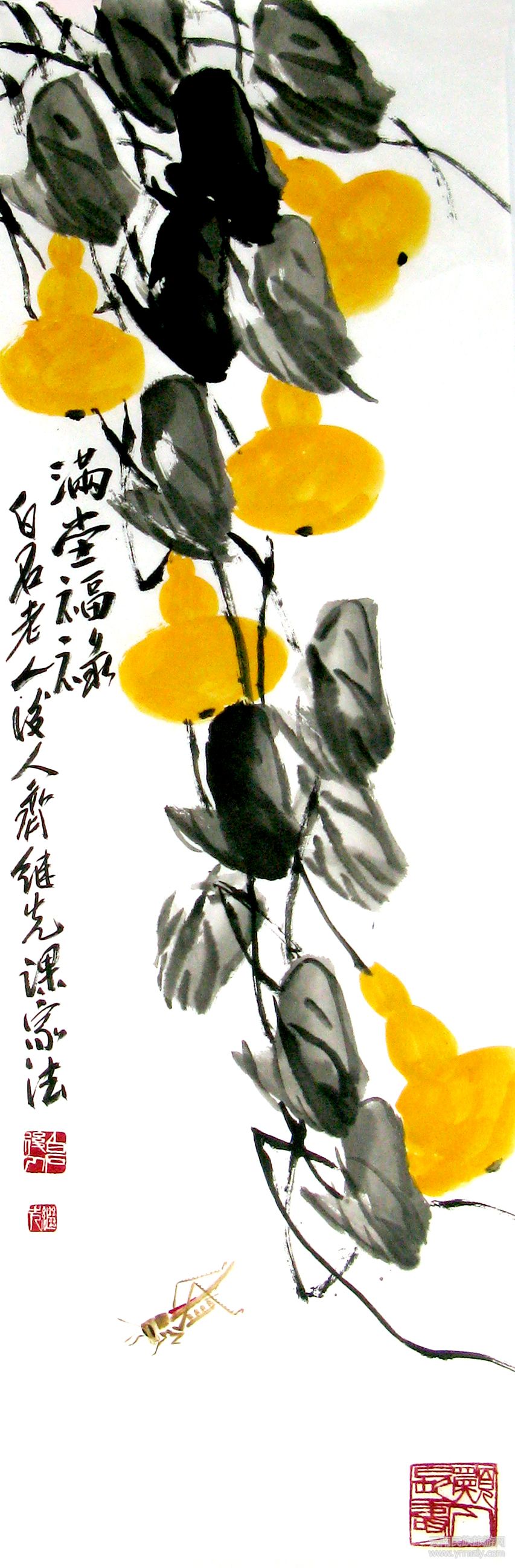 在藝術(shù)傳承與創(chuàng)新之路上,他堅(jiān)持曾祖白石老人把富有農(nóng)民生活氣息的民間藝術(shù)情趣融入創(chuàng)作的思想,及“似與不似之間”的畫論;并利用白石后人的優(yōu)異條件,認(rèn)真揣摹曾祖各個(gè)時(shí)期不同花鳥(niǎo)魚(yú)蟲(chóng)、山水及人物畫的表現(xiàn)手法、特點(diǎn),吃透曾祖的構(gòu)圖、用筆、用墨;然后,孜孜不倦的觀察,孜孜不倦的畫;最終,在傳承中形成了自己的畫風(fēng):山水畫構(gòu)圖不落俗套,隨意生發(fā),富有真山真水的靈性;花鳥(niǎo)畫筆墨渾厚圓潤(rùn),色彩濃烈,色調(diào)明快,手法簡(jiǎn)練,意境淳厚樸實(shí),作品中的魚(yú)、蝦、蟲(chóng)、蟹妙趣橫生,活靈活現(xiàn),傳承了‘齊派’藝術(shù)的風(fēng)采。