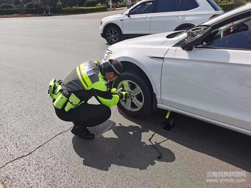 云南民族旅游網(wǎng)訊(通訊員 張競(jìng)月 蔣梅霞)2月23日上午11時(shí)30分左右,曲靖經(jīng)開交警大隊(duì)騎警巡邏至大花橋環(huán)島時(shí),發(fā)現(xiàn)一輛白色轎車打著雙閃停在行車道上,見狀執(zhí)勤民警立即上前詢問情況,車主焦急地向民警說道,自己車輪胎被扎,導(dǎo)致爆胎,雖然車上有一只備用輪胎,但無奈不會(huì)更換,只能停車等待救援。