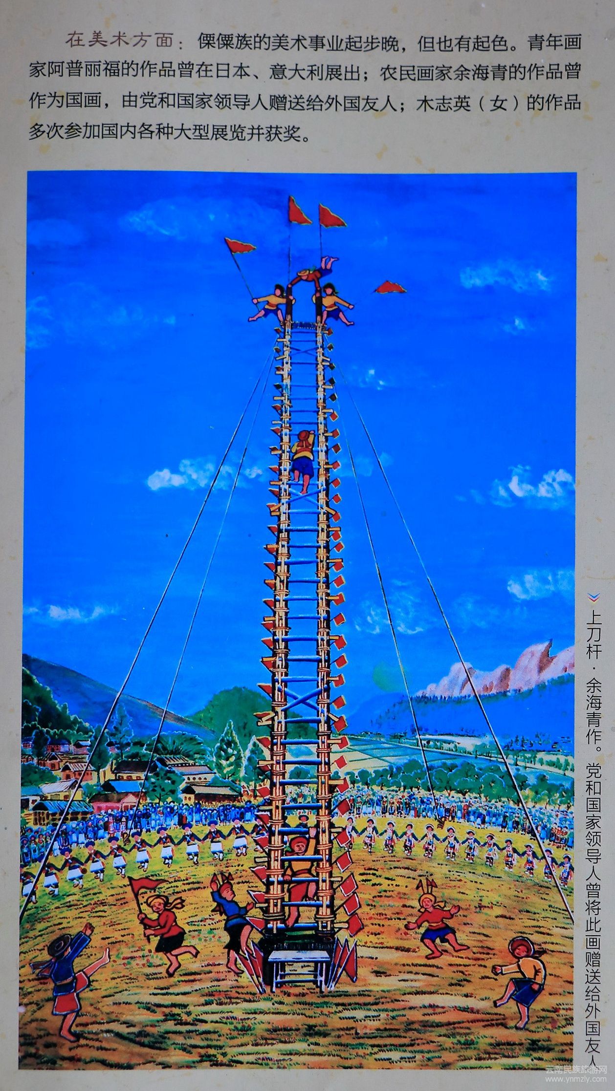 在成為傈僳族畫家的過程中,厚重的民族土壤及黨和政府的關(guān)懷一直是他不竭的創(chuàng)作源泉和動力。 自從處女作《放豬》1974年參加全國農(nóng)民畫畫展,并于1979年被登載在《民族畫報(bào)》第一期后,他于1975年從棋盤石自然村單小調(diào)入聯(lián)族完小任教。1981年,他的畫作《上刀桿》入選由國家文化部、國家民委、中國美術(shù)家協(xié)會舉辦的全國少數(shù)民族美術(shù)作品展,他到北京領(lǐng)獎(jiǎng)后,該作品又于1984年被時(shí)任中共中央總書記胡耀邦作為國禮,贈送給來華訪問的日本青年代表團(tuán),同時(shí),他也于1983年正式轉(zhuǎn)正,成為國家編制內(nèi)教師。