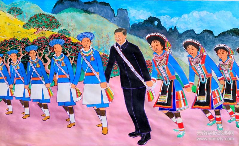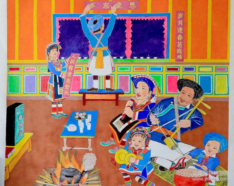 他曾系統(tǒng)研究過滇灘傈僳族的遷徙發(fā)展史,知道祖先來自怒江州石月亮,所以,在《永遠(yuǎn)跟黨走》即以祖先發(fā)源地石月亮為背景,以黨和國家領(lǐng)導(dǎo)人習(xí)近平身背傈僳族挎包,與傈僳族青年男女載歌載舞為中心,揭示出不忘黨恩,不忘宗祖的主題?!恫煌h恩》這幅畫,又以歡快喜慶的格調(diào),繪制出一對青年夫婦正在張貼“歲月逢春花遍地,人民有黨志登天”的對聯(lián),爺爺奶奶及孫男孫女四人正在火爐旁,一面擊鼓、奏樂,一面手持話筒,對著音箱高聲吟唱歌曲的畫面。