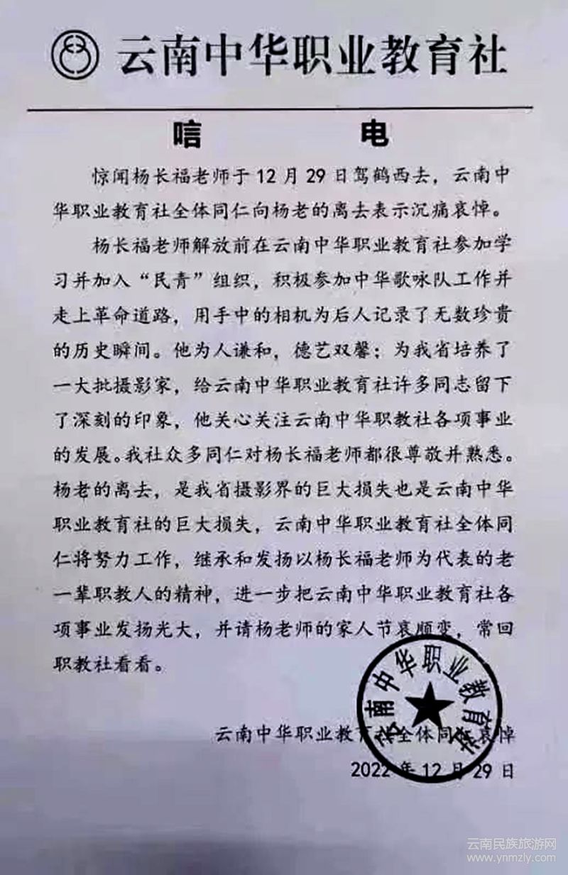 昆明攝影家協(xié)會(huì)名譽(yù)主席楊長(zhǎng)福先生因病醫(yī)治無(wú)效,于2022年12月29日7時(shí)35分在昆明不幸逝世,享年93歲。