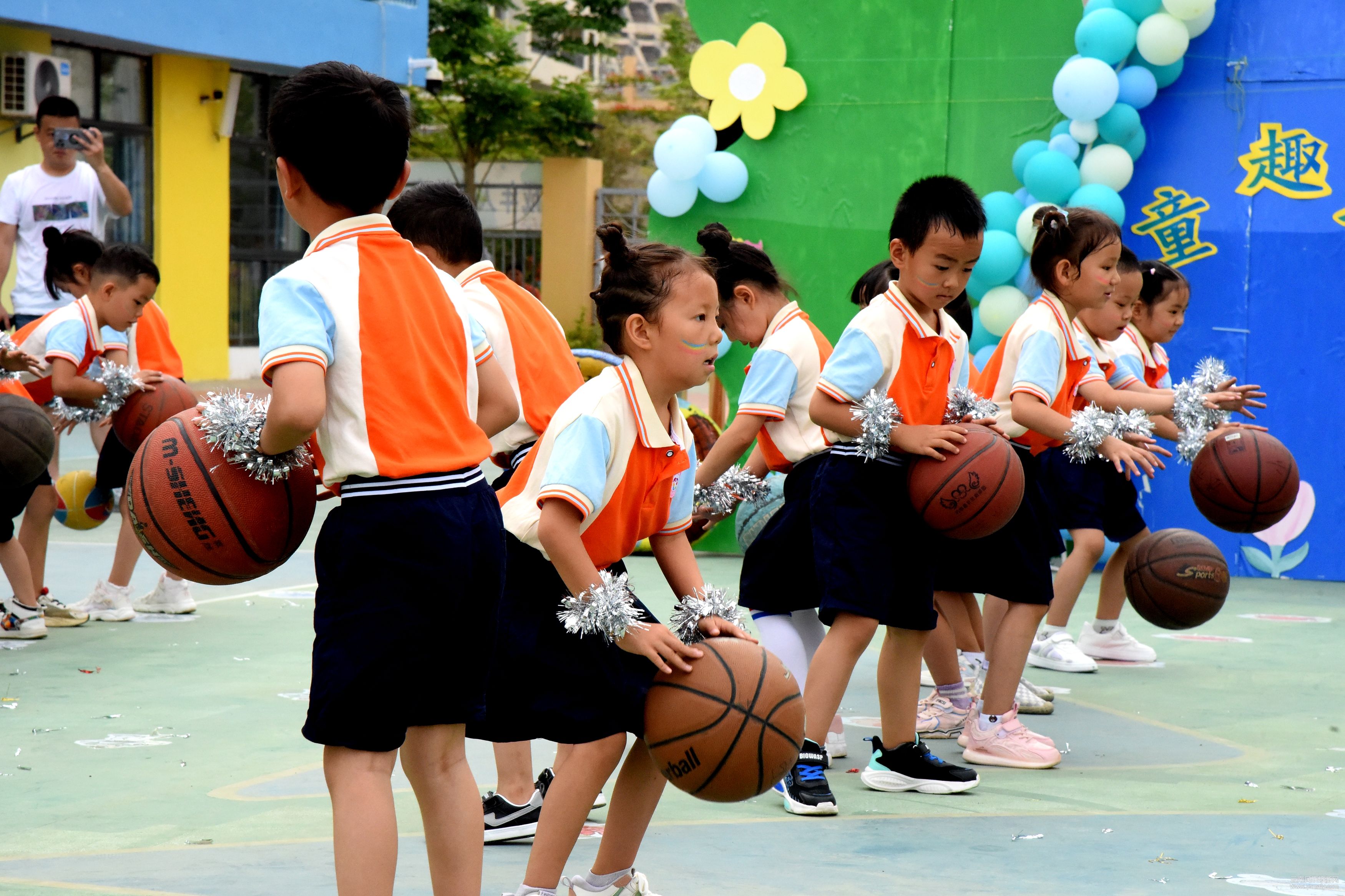 小班創(chuàng)意器械操《我是一顆跳跳糖》萌萌可愛;中班器械操《向前沖》游戲性十足;大班籃球器械操精氣神滿滿;幼兒教師開場舞朝氣蓬勃,充滿青春活力。