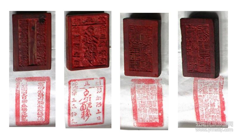 左一:云南永昌府騰越廳屬世防滇灘關土目柴森梁之鈐記;左二:滇灘隘土目柴三春鈐記;左三:滇灘關應襲柴正春鈐記;左四:世襲滇灘關土千總柴之鈐記。