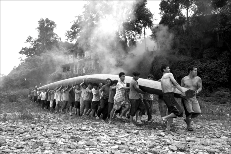 作品采用了黑白影調(diào),就更顯得意蘊(yùn)凝重,既把這種古老的民俗活動(dòng)延伸進(jìn)歷史的回憶,又讓其在歷史的長(zhǎng)河中,能夠不斷延續(xù)。而且作者擷取了賽龍舟過(guò)程中的一個(gè)斷面,更耐人尋味深長(zhǎng)。你可以想象當(dāng)初要把深山里的參天大樹(shù)變?yōu)橐粭l龍舟抬到這里,是如何的巨大艱辛與困難,這是對(duì)整個(gè)族群的毅力考驗(yàn)與動(dòng)員,包括智慧、力量和信仰,沒(méi)有這些綜合因素,是不可能做到的。