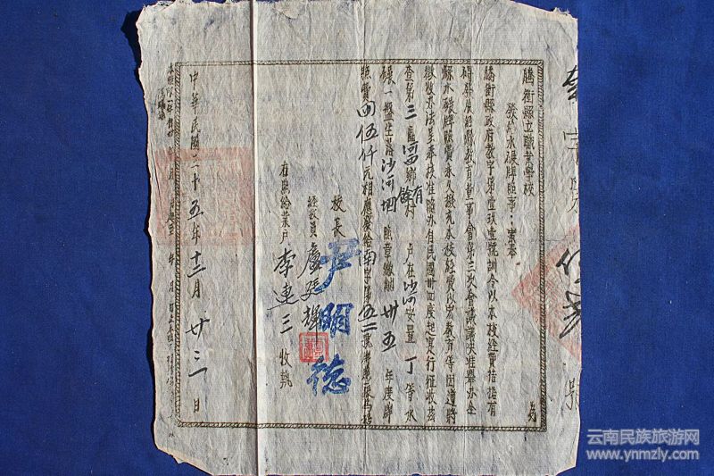 民國35年12月騰沖職業(yè)學(xué)校校長尹明德發(fā)給的水碾牌照 (賈志偉收藏)