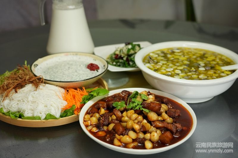 新鮮采摘來的堅果去殼洗凈用榨汁機榨成汁,再將新鮮韭菜切細(xì),配以切碎的香柳、緬芫荽、食鹽、辣椒面、味精、檸檬汁等調(diào)料拌勻,再倒入堅果汁就變成了一份鮮美的蘸料,燙好的米線搭配手撕牛干巴、胡蘿卜絲、包菜絲等配菜堅果撒就完成了。