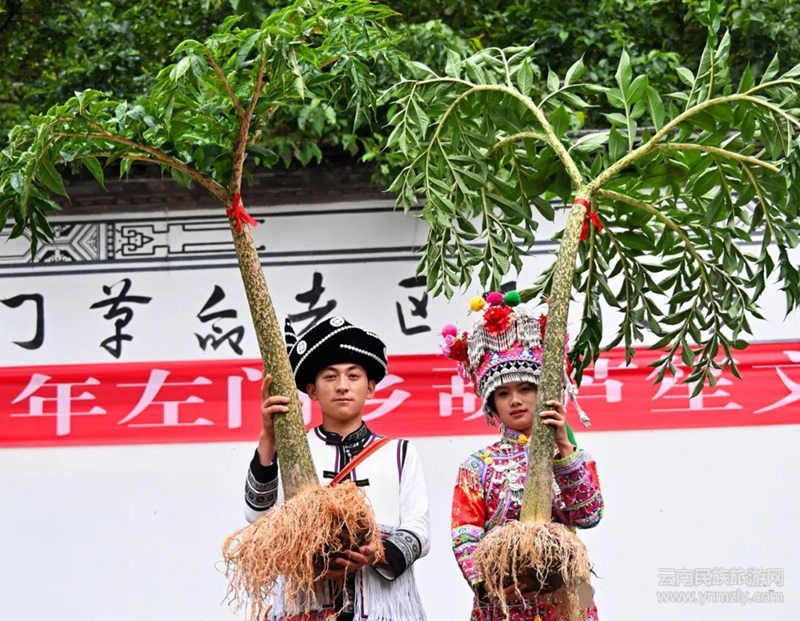 左門葫蘆笙文化節(jié)的重要活動內(nèi)容之一就是“豎秋桿”。左門“豎秋桿”是本土文化的特色活動。三棵秋桿一樣粗,一棵長,兩棵短,分別是松樹、香椿樹、秋木樹等類的樹種,用彝族的三色文化基調(diào):紅、黃、黑,分別涂染。紅、黃、黑三色文化是彝族特有的傳統(tǒng),三角撐起,三頂集合點相擁抱。三棵各有各的名稱,短紅的是希望柱,長黃的是頂天柱,黑色的是平安柱。它代表三個意義,紅色代表紅紅火火,黑色代表穩(wěn)重厚道,黃色代表輝煌騰達,也代表民族團結(jié)和睦共處。
