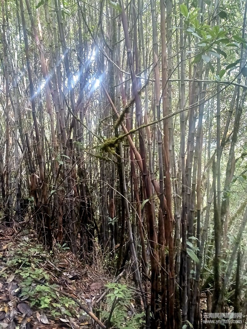 路旁山林中,實竹鋪天蓋地、密不透風。越近山巔,實竹越多,有的竹子,因長期無人砍伐,能生長數(shù)十年,甚至上百年,滿身沾滿苔痕,斑駁陸離,高達七、八米,令人嘆為觀止。除了實竹,也有少量的青岡木、杜鵑紅、鐵杉等樹木。