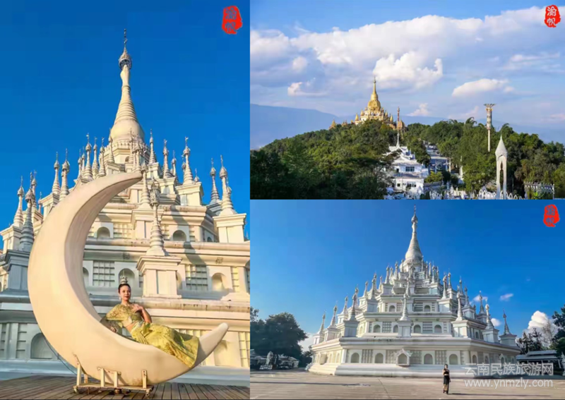 (附資料: 勐煥銀塔是一座新建的南傳佛教佛塔,又名萬佛塔,學(xué)名八萬四千塔,2009年規(guī)劃建設(shè),2013年建設(shè)完工,2019年對外開放,與勐煥大金塔相隔不遠(yuǎn),同位于孔雀湖畔的雷牙讓山之上,分立兩個山頭,一個金碧輝煌,一個銀光熠熠,一金一銀,遙相呼應(yīng)。