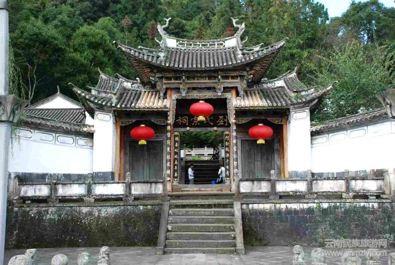 2、劉氏宗祠位于水碓村與尹家坡之間,位置選擇相對呈交椅凹形的山角,坐南向北,依山傍水,占地1000平方米,由正殿、兩廂樓、東西花園、前廳、大門組成。始建于清咸豐五年(1855),次年兩廂、前廳俱毀,光緒六年(1880)修復(fù)舊觀。民國九年(1920)擴(kuò)建前廳,新修三開間牌樓式大門,增建月臺,并立石斗標(biāo)桿于月臺上。月臺前新筑雙孔石拱橋,橋下有池種荷,具有園林之盛。前廳還遺存一塊“御龍深遠(yuǎn)”木匾,為綺羅李治用章草書寫;一塊清乾隆三十五年“保我子孫”三十六年“永免錢糧”雙面石碑,均保存完好。門前石標(biāo)桿為清光緒壬年科亞元劉宗鑒所立,毀于文革?,F(xiàn)已于2005年4月恢復(fù)。同時還恢復(fù)了大殿“千秋萬祀”、“飲水思源”兩塊匾額,分別由省內(nèi)書法家李華君、趙浩如用行書書寫。在家堂柱上增加了馬有樊撰李超杰書的“福田宗祖種,巴山蜀水規(guī)模遠(yuǎn);心地子孫耕,鳳嶺龍?zhí)督B述長”的楷書對聯(lián)。大殿中堂兩旁增加了劉碩勛撰并書的“祭必以時,春露秋霜崇祀典。人本乎祖,父慈子孝重人倫”魏碑字聯(lián)及檐柱尹文和撰、饒學(xué)興書的“鳳棲鳳山飛彩鳳;龍蟠龍水出文龍”篆書聯(lián)。大殿走廊兩側(cè)增加了“西漢高祖,東漢光武帝,蜀漢昭烈帝”三祖遺訓(xùn)石碑。過廳增加了孔學(xué)軍書寫的“術(shù)通乾象,喜入天臺;雕龍名著,殿虎英風(fēng)”魏碑字聯(lián),劉振東撰、馬有樊書的“巴山施仁,總旗洪武安三迤;盈水懷遠(yuǎn),御龍騰越振九州”隸書聯(lián)及劉碩勛撰并書的“要好兒孫,須從尊祖敬宗起;欲光門第,還是讀書積善來”魏碑字聯(lián)。大門新增了尹文和撰、趙翼榮書的“溫暾世家仁智禮;騰陽冠冕龍鳳麟”魏碑字聯(lián)及馬有樊書的“門對龍?zhí)肚Ч判悖蛔寰油厝f年春”行書聯(lián)。修復(fù)后的劉氏宗祠使人耳目一新。