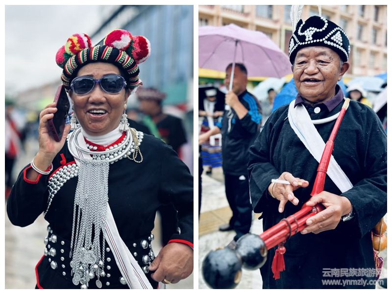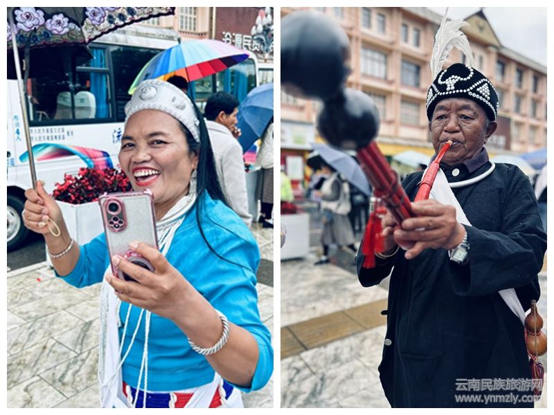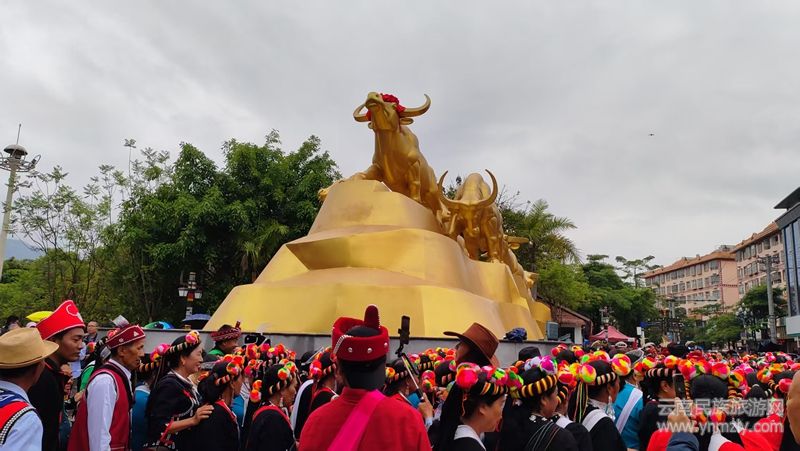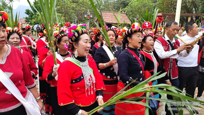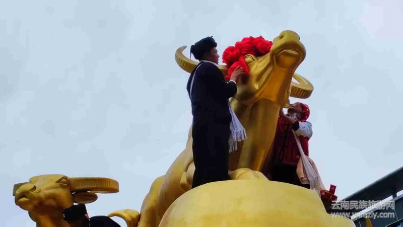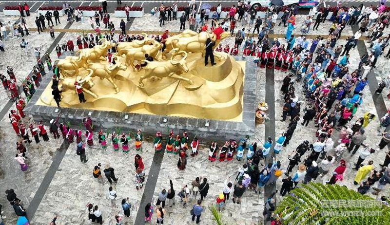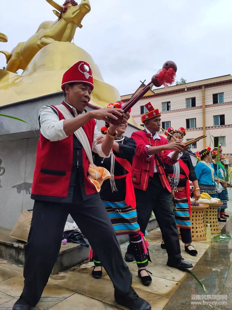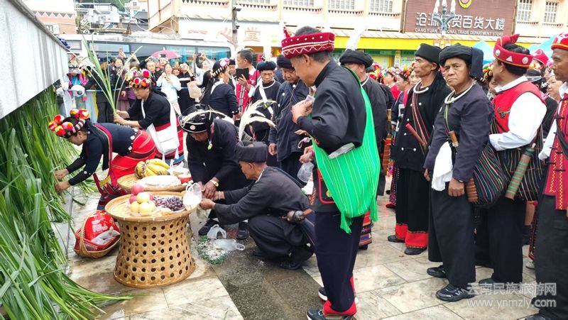 儀式現(xiàn)場,九頭牛雕塑前擺放著糯米粑粑、芭蕉、茶葉、糯米飯、米花、水果等。隨著主持人宣布儀式開始,百名佤族老人緩緩入場,洗牛頭、系紅布、戴紅花,游客們?cè)谄砀B?、蘆笙聲、傳統(tǒng)打歌調(diào)聲中體驗(yàn)了一場別具佤族風(fēng)情的民俗活動(dòng)。
