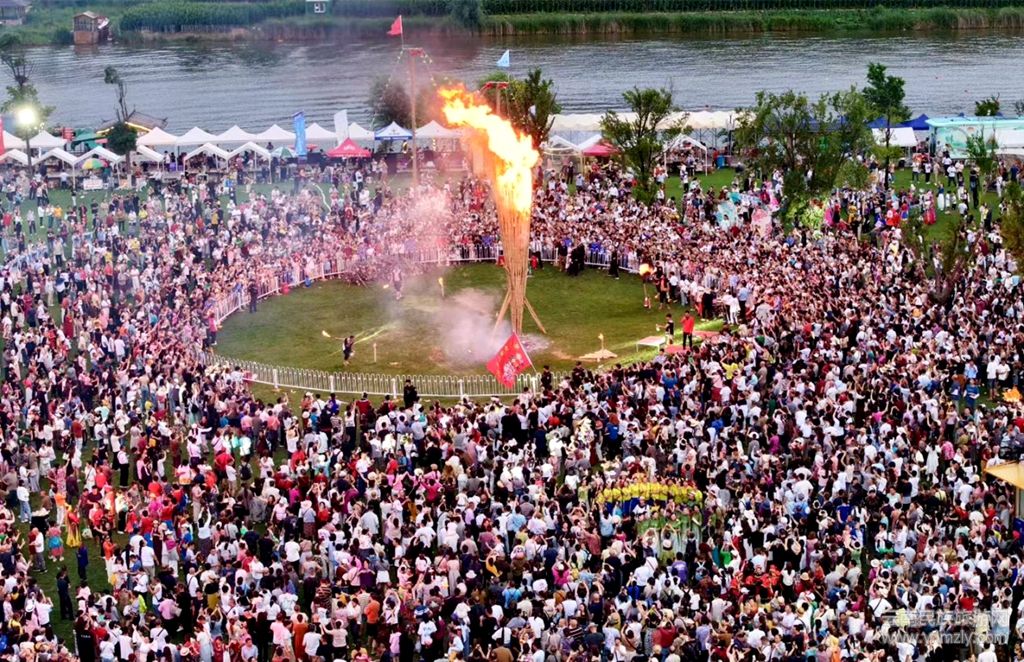夜幕降臨,最令人矚目的弓箭手箭矢點(diǎn)火儀式如期而至。隨著利箭破空,高達(dá)10米的巨型火把被瞬間引燃,熊熊火焰照亮了整個(gè)夜空,現(xiàn)場(chǎng)歡呼聲、鼓掌聲此起彼伏。隨著麒麟踢打舞《喊你不要睡懶覺》音樂起,游客與市民手牽手,圍繞著篝火歡快地跳起了舞蹈,大家不分彼此、不論籍貫,在跳動(dòng)的火光中釋放最純粹的喜悅,讓歡樂在人群中無限傳遞。