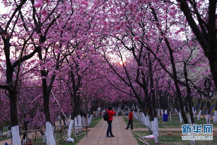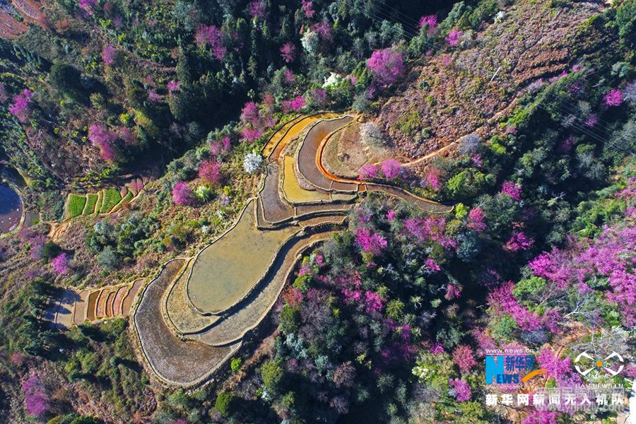 航拍:哈尼山寨櫻花盛開 與梯田相映成趣